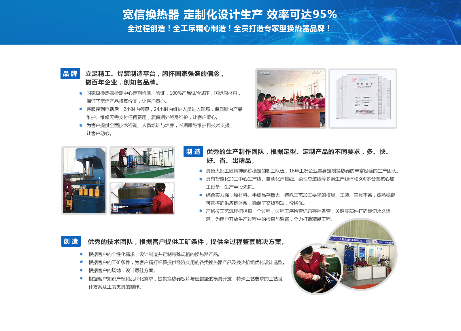 合肥寬信機(jī)電有限公司成立于2002年,是從事熱交換器、余熱回收、煙氣廢氣熱回收與凈化處理、熱泵機(jī)組及其應(yīng)用、汽車零部件研發(fā)、制造、銷售與工程服務(wù)為一體的高新技術(shù)企業(yè)。公司位于合肥上海產(chǎn)業(yè)園,占地60畝,擁有40000多平方米標(biāo)準(zhǔn)化工業(yè)廠房,10000多平方米研發(fā)、營(yíng)銷、服務(wù)綜合樓,各類生產(chǎn)、檢測(cè)、實(shí)驗(yàn)設(shè)備300多臺(tái)套,科研技術(shù)開發(fā)團(tuán)隊(duì)50多人,自主知識(shí)產(chǎn)權(quán)及國(guó)家專利和研究成果60多項(xiàng),在熱交換器、余熱回收、熱泵機(jī)組應(yīng)用、廢氣凈化處理方面都具有較強(qiáng)的實(shí)力。
